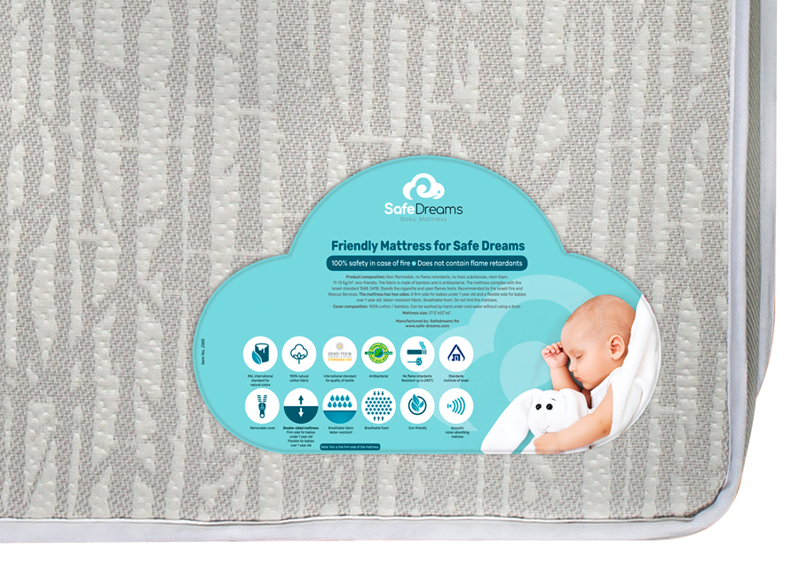 הרכב המוצר: אינו נדלק, ללא מעכבי בעירה, ללא חומרים רעילים, הספוג עשוי משרף, 11-13 ק"ג/מ"ק. ידידותי לסביבה. הבד עשוי מבמבוק, אנטי בקטריאלי. המזרן עומד בתקן 5418. עומד במבחן הסיגריה ובמבחן האש הגלויה. מומלץ ע״י הרשות הארצית לכבאות. למזרן 2 צדדים: צד קשיח עד גיל שנה וצד גמיש מעל שנה. הבד בלתי חדיר לנוזלים. הספוג נושם.